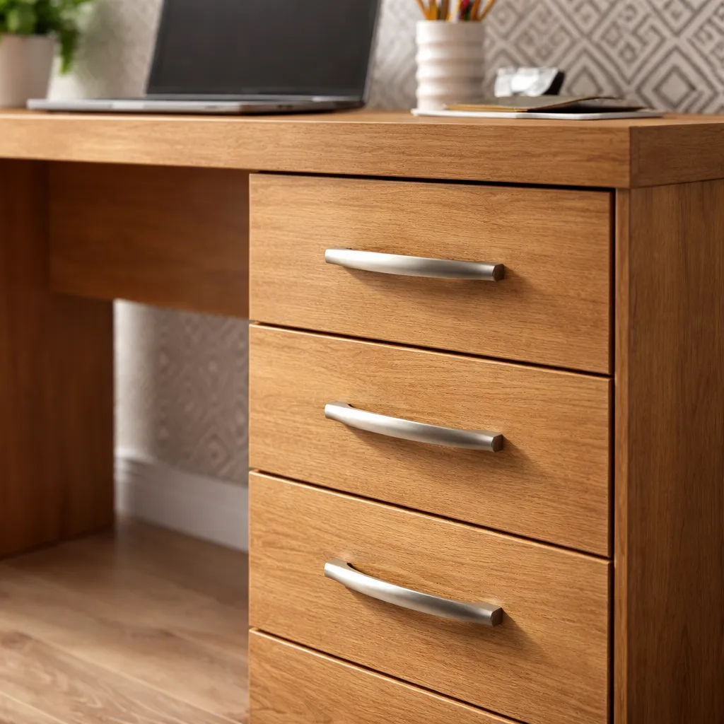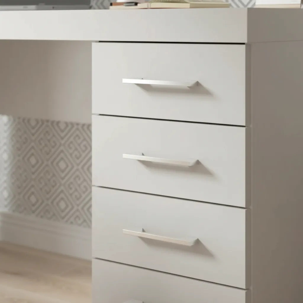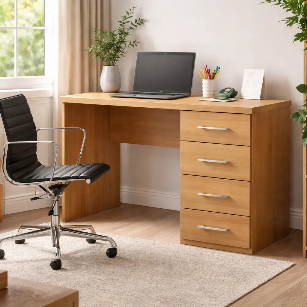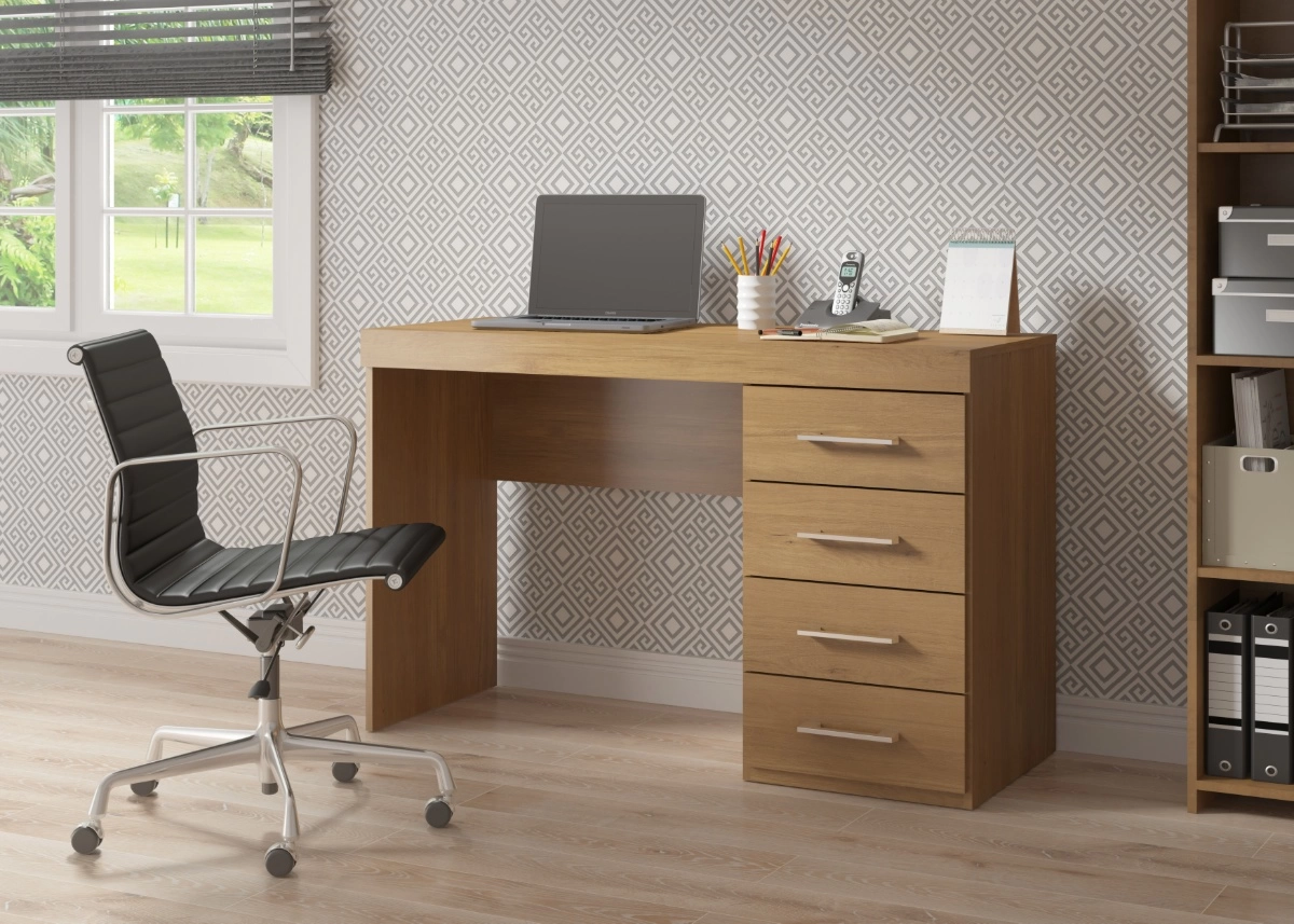 Su diseño de líneas simples se adapta fácilmente a oficinas, escritorios o espacios de estudio. La estructura robusta brinda estabilidad, mientras que los cajones con tiradores metálicos permiten guardar útiles, documentos y accesorios al alcance de la mano.